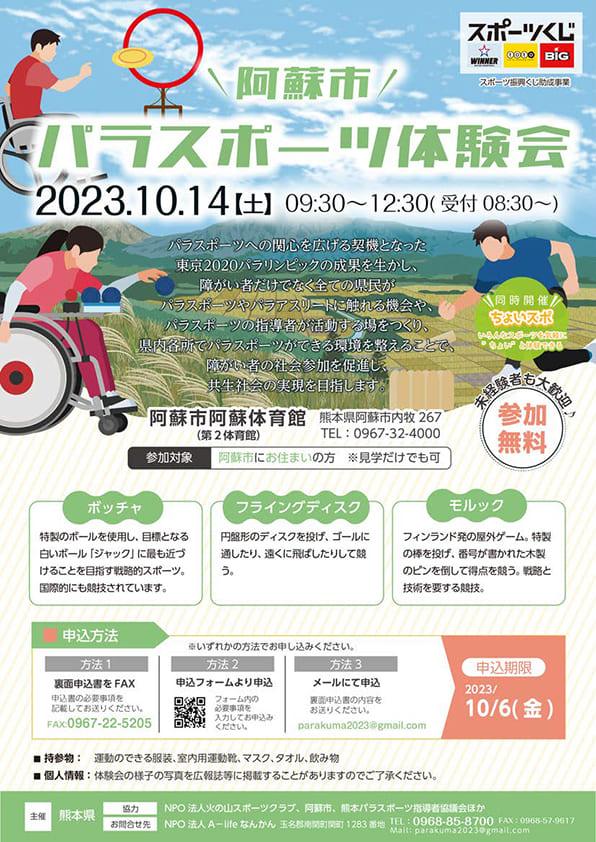 2023年10月14日(土)9:30~12:30(受付08:30~)阿蘇市阿蘇体育館にてパラスポーツ体験会が開催されます。